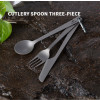 A complete set of titanium cutlery called NOBU has a practical carabiner for attachment. The set consists of a spoon (20g), a fork (14g) and a knife (14g). The blasted surface of the cutlery prevents fingerprints.